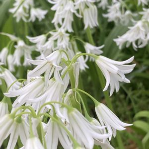 《「アリウムトリケトラム」〜和名は?》 春に白い花を咲かせるネギ属(アリウム属)の球根植物で、花は釣鐘状に数輪咲かせ花弁に濃いグリーンが一筋入ります🤗 和名の名が示す通り、ネギの仲間で花茎や葉の断面が三角になっています🤗🌼 「君の名は」