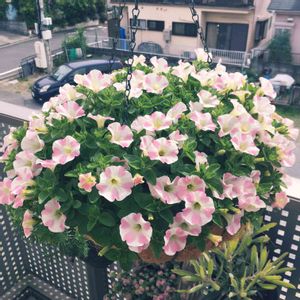 お隣の宿根かすみ草とサフィニア桃色ハート💓💓💕 92歳のおばあちゃん製作の籠がすてきなお隣さん お花もたくさん撮らせてもらってます❣️
