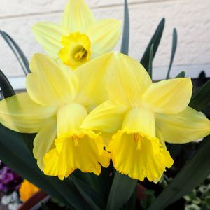 ラッパ水仙、ピスタチオです。同じ鉢で3年も咲いてくれた有難いお花です😊写真だとわかりにくいですが、花筒の下半分から花弁の中央にかけて白っぽく色が抜けてくるのが特徴で、咲き始めは黄色一色に見えます。こういうのを逆色ラッパなんて呼ぶこともあるそうです。逆、というのは、水仙は、全部黄色や全部白の他に、花弁が白で筒が黄色というのもありますが、逆に、花弁が黄色で筒が白という色は昔はなかったのです。今は結構そういう品種も増えてきているので別に珍しい感じはしないかもしれませんねー。んんじゅうねんまえに、「スペルバインダー」という品種を初めて見たときの衝撃は、今から思うとあほみたいですが、ほんとにがびーん!👀というものでした。花弁も細目で縒れていて、昔風の花型で、今はもう販売されているのを見なくなりましたが、もし見つけたらまた買ってしまうでしょう😅それほど逆色って、画期的な品種だったんですねー(*^▽^*)今ではずっと整ったきれいな花型で、色もくっきりはっきりした逆色の新しい品種が多数出ていますが、郷愁というか、思い出なんですねー、名前もちょっと素敵ですよね😊脱線しましたが、このピスタチオも、なかなかきれいなレモンイエローで、お気に入りの品種です。長持ちしてくれたのでさらに好きになりましたヾ(≧∇≦)ノ
