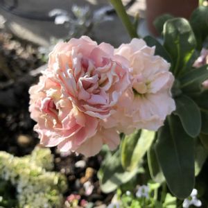 ①春色の花色が可愛いストックさんのアップです🌸 ②目の覚めるような濃い青紫色˚✩‧₊˚早くも一輪咲いています🔹🔷 ③可愛いピンクボール💕