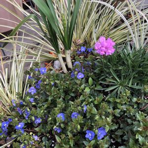 ①金魚草が満開です🌸♬︎*.:*雨の前に📷✨ ②アルメリアさん🩷遅咲きのベロニカも咲いています💙 ③こぼれ種からのオルレア&ニゲラ🤍💙🌿 ④雨で軒下に避難中のブルースター💠