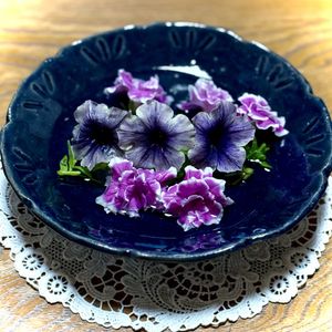 陶芸教室で作った器で 花手水を楽しんでみました💗 (手は洗えないから😆フローティングフラワーですね) ペチュニア 花衣 紅水晶 ペチュニア モンローウォーク どちらもまたよく咲いてくれてて 切るのが惜しくなったから🤣花数少なめ💦