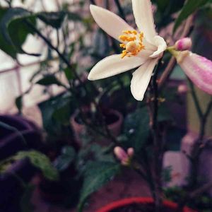 義母が育てているレモン🍋の花🌼咲いてます 冬は凍結防止のため室内に〜 季節間違えたかな笑 早く🍋できるといいなあ😊