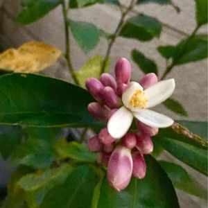 こんばんは。 朝咲いてなかったのに、今見たらひとつ咲いてました🤗 レモンの🍋花。 蕾はピンクでもやはり白い花でした‼️ さぁ、ここからが勝負! 🍋の実をつけてもらうための作業…調べます😅