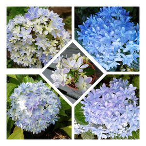 アジサイ💙万華鏡 3~4年前の母の日のプレゼントに貰ってから 大のお気に入り(右側上下) 挿し木にした真ん中◇の赤ちゃん株は 今色付き始めています💓(左側上下)