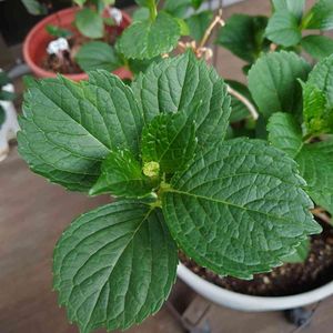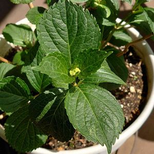 アジサイ万華鏡の成長記録2021年その16 2021年4月27日 花芽の向きが偏らないように鉢の向きを変えたところです 葉の裏がこちらを向いています