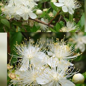 まっ白なギンバイカ(マートル) の花、長い蕊がモフモフで優しい香りです✨✨ 花はハーブの一種で良い香りがします。 結婚式祝いに用いられるので祝の木の別名があります。 アジサイ科 バイカウツギ属