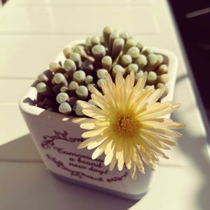 🟨フェネストラリア 五十鈴玉錦🟩 少しだけ斑入りの株ですが、今回は花の写真です。 冬型多肉植物の五十鈴玉は、おかしな形の葉っぱからは想像つかない、普通に綺麗な花が咲きます。 タンポポのように、昼頃に開花して夕方にはすぐしぼんでしまうようです。 五十鈴玉のそっくりさんに群玉という多肉植物がいますが、花の色で見分けられるそうです。五十鈴玉は写真の黄色で、群玉は白色らしいです。 色々な多肉植物を育てていますが、どうしても五十鈴玉は育てるのが苦手で、過去に何度も枯らしてきたのですが、今回初めて夏越しからの開花までくることができました。 鉢の置き場所をより風通しの良い場所にして、水を少なすぎず多すぎずうまいことやるようにすると、猛暑でもギリギリ夏越しできるようです。 冬越しも頑張ります!