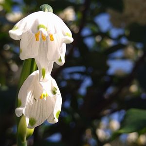 見上げてみると.。o○ スノードロップと思ったら スノーフレークでした。 お花の名前を 教えて頂き感謝デス❣ 2つのお花似てるようで 見比べると違いが色々 観察力を磨かなきゃ💦 🤍🤍🤍🤍🤍 スノーフレークの花 鈴蘭のように丸っこく、 花びらの先はフリルのよう🤍 釣鐘状の花がスズラン 細長い葉がスイセンのようなので、 鈴蘭水仙とも言われてるそうです。 白い花弁の縁に緑の水玉のような斑点が特徴的ですね🤍💚🤍