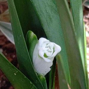 鞘を割って、出てきたばかりのスノーフレーク 緑色の斑点が可愛いらしい ここから何個か鈴蘭のようなお花を咲かせてくれます