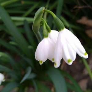 湧水流れる公園 遊歩道脇に咲く スノーフレークの花 (鈴蘭水仙) ヒガンバナ科 スノーフレーク属