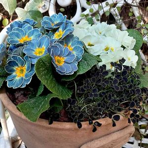 1月11日寄せ植えした プリムラジュリアン モネ 二株と クローバーティントナイト (小ちゃくて、可愛い葉1.5㌢程) こんもり良い感じに🥰✌️
