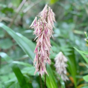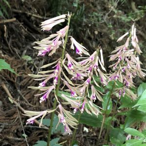 サイハイラン(采配蘭) ラン科 雨に濡れた後で花は下向きに下がってましたが こちらの方が紙を細く切って房にして柄につけたものをイメージできるかも⁈ 武将が兵を指揮するときに使う武具(采配) に花が似ていることから付けられた名前 なるほど🤔 高さは30〜40cmで1枚の葉と1本の花茎で 葉は冬でも残るそうです。 でも見つけられるかな⁈