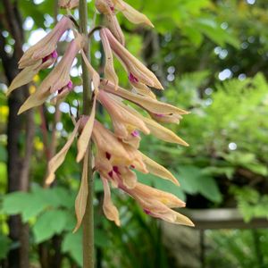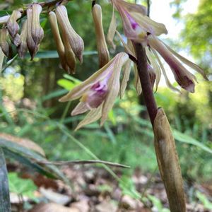 サイハイランが蕾からようやく咲きました。 花を戦国時代の指揮具、采配に見立てて名前が付きました。 花は半開き状態で平開せず、細長い花が斜めに下垂して咲き、唇弁と花柱に紅紫色の模様が入ります。 花の長さ 3cm位 ラン科 サイハイラン属 🏷地味だけれど可愛いラン