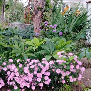 ピンクの友禅菊が開花しました。 道路側の傾斜の天辺に植えてます。 後ろはクリスマスローズ