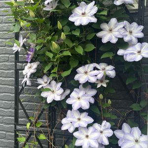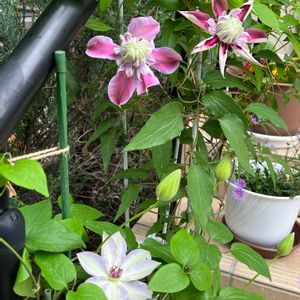 咲き始めた大好きなクレマチス さん💜💕 裏庭に控えてる他の子も、咲きそうになったらこの並びの位置に移動してもらいます🎶 油断すると お隣同士で 蔓が絡み合うのですが😅 薔薇も蕾が膨らんできて 嬉しい季節がやってきました💜❤️💕