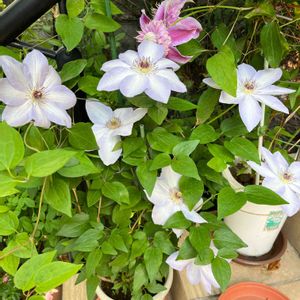 鉢植えクレマチス1(記録用)🐸🐸🐸 上:ブルーエンジェル(2年目 新旧両枝咲き 四季咲き)ジャックマニー系 水色 枝が太くなりました 下左:ジリアン ブレイズ(1年目 旧枝咲きパテンス系) 下右: [左] ルージュ カージナル(1年目 旧枝咲きジャックマニー系) [右] イワン オルソン(1年目 旧枝咲きパテンス系)