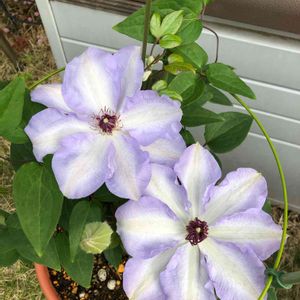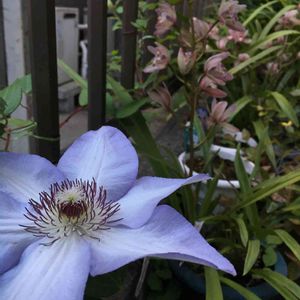 今朝から我が家で2種目に開き始めた クレマチスのイワン・オルソンさんです🎵 昨年春にサンシャインシティでのクレマチス 展からお迎えした子です🌸🍃 今年はコロナで開催されず残念です💧