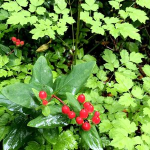 ヒペリカムの赤い実があざやかです❣️ 背景の葉っぱはサラシナショウマ 秋に白い穂がステキな自生している植物ですが、鹿の食害に悩まされています💦 毒性のあるヒペリカムをそばに置いて、少しでも守れたらと期待してますが、なかなか😅