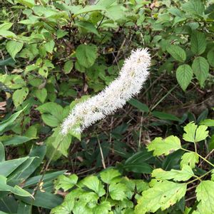 サラシナショウマ-晒菜升麻-(キンポウゲ科) 夏の終わり頃から落葉樹林内などで咲きます。白いブラシ状に咲きます。 和名は、若菜をゆでて水でさらして食べるところから「晒菜」、また根の部分は肥大し「升麻」と呼ばれる漢方薬になるとのこと。 咲き始めですが、草丈があるのでよく目立っていました🌸