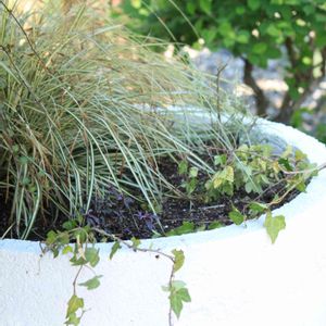 土管?を白く塗装して庭のあちこちからかき集めた植物を植えました。