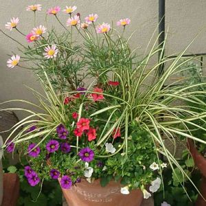 マーガレット ベアグラス 紫と白のカリブラコアの寄せ植え のはすが❗❗ 育ってきたら赤が出てきた❗買った時は2色だったのよ❓❓ まさかの3色ミックスだったみたいσ( ̄∇ ̄;) 私の好みじゃないけど…まあ…いっか(苦笑)