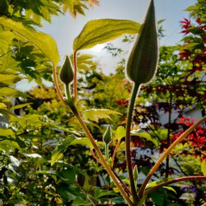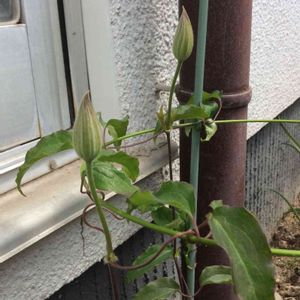 おめでとう🎊の蕾、2種💞 ✲金曜日の蕾たち✲ に参加させていただきますm(_ _)m 田舎のお盆には、今年も行かないことにします😰 事態の深刻さをみて、自宅にいることかBestと考えました。🌺実家のハイビスカス🌺の挿し木🍃また蕾がつきました🤗 お墓に行けないかわりに、実家の挿し木に手をあわせます🙏 💠クレマチス💠は、一度ほとんど枯れてしまい、『もう、ダメかな』とがっかり🤭でも、[クレマチスは地面の下の根っこから新芽をだす]と情報を得、新しい土と鉢に植え替えました。🤗だんだん元気になって😊、信じられないほどの緑🍃芽をだしてくれて、支え帽をつけたら、巻きついて、とうとう蕾をつけてくれました💞🗯やったぁ♥️湘南のクレマチス💎って、札に記されてました、よかったァ🎊『ありがとう、クレマチスさん💠』