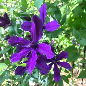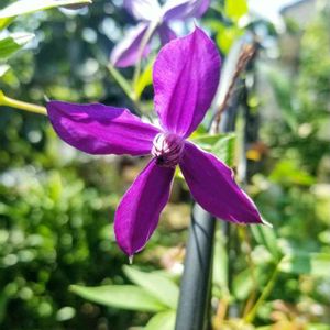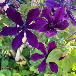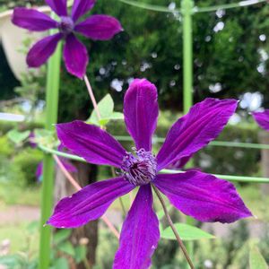 クレマチス アフロディーテエレガフミナ🌱蔓にならないクレマチスで1mくらいでしょうか。自立しないのでフェンスに誘引しています😊 花芯まで濃い紫で、庭の引き締め役です☺️