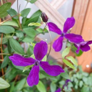 初めてのクレマチス! 通販で購入。蕾がついていたのがあと少しで開花! バックはバラのピンクサマースノー。まだ咲き始め。 共演はどうなるかなー?楽しみ。