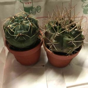 小さい鉢に植わったサボテン¥100 刺の長いのは翠晃冠❔ 左は緋花玉❔