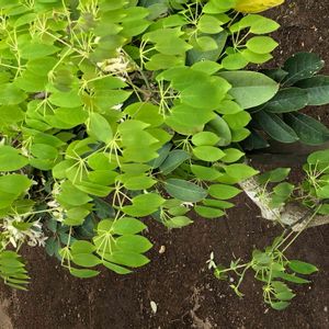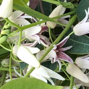 navyさんとsachiさんのお陰で、早くも不明だった、植物の花の名前が、「アケビ」に似た実を付ける「ムベ」の花と解りました‼️早速❗️教えて戴きまして、ありがとう😊ございました😊‼️ 4月17日、石井町付近の家の軒先で、沢山の葉の中から、所々顔を出す、白く可愛い💕花を見つけました⁉️ 名前が解りません⁉️ご存知の方教えてください‼️よろしくお願い致します‼️