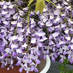 4月17日、石井町付近の家の軒先で、4月中旬の季節としては、もう山藤色の沢山の花🌸🌸🌸を下げ始めた、鉢に植えられ、盆栽状の美しい、藤の花🌸を見つけました‼️