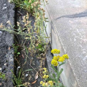 ブロックの隙間ちゃん まぁ正確には隙間じゃなくて空き地の子なんだけど セイタカハハコグサと思う ハハコグサみたいなブロッコリー型の花だけど褐色で地味 チチコグサっぽい色だけど形はハハコグサに近い セイタカと言いながら背は高くない個体 この辺はハハコグサよりこればかりが目立つ