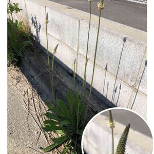 ブロック塀の隙間さん 高さ60cmはあろうかという巨大ヘラオオバコ 遮るものがほぼ無い為かあまりの生育の良さに声が出てしまいました 花穂も大きい!