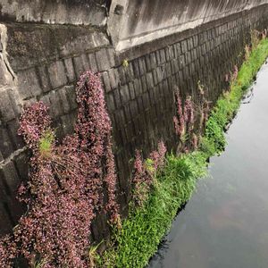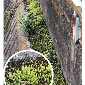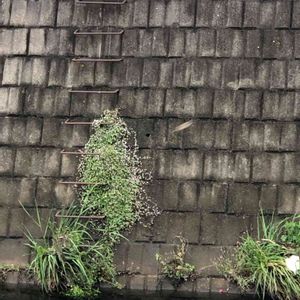 河岸の壁の段差にて 苔の上にセダムらしき植物が… フェンスの下からスマホを挿し入れて撮ってみたけど落としそうで恐かったです よいこのみんなは真似しちゃダメです