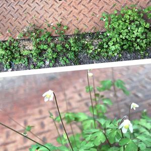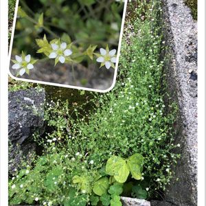 駐車場の端っこにて 白くて小さい花は種類がたくさんあるけど花弁に切れ込みがなくてガクが尖ってたら多分ノミノツヅリ 葉っぱからぴょーんぴょーんと花の茎が伸びる姿が可愛い