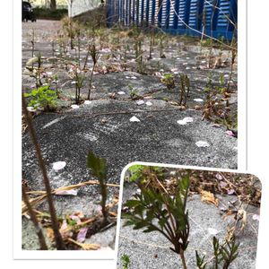 歩道の石タイルの隙間から至る所にニョキニョキ生えてた何かしらのつる性らしき植物 すごい景色だった… 樹木はあまり詳しくないので全然検索のヒントが見つかりません… ヤブガラシかな? 奥にうちの老犬を乗せたカートが写ってる笑