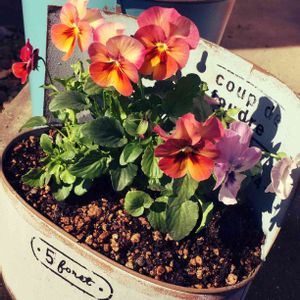 おはようございます😊☀️ ビオラ✨かわいい入れ物に移してみたら、かわいいくなりました💓いっぱい咲いてね〜。。 寒いけど今日も色々頑張りましょう😊💖