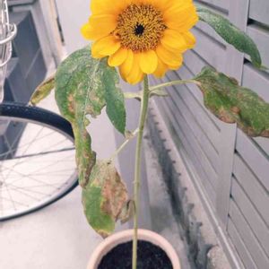 ひょろひょろな茎で傾いてるけど、頑張った❗❗ 虫に負けずに咲いたひまわりさん🌻