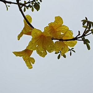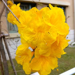 イペー(コガネノウゼン) [ノウゼンカズラ科タベブイア属] 近所で綺麗に咲いていました。 イペーは、ブラジルの国花の一つとなっており、日本では、別名(和名)コガネノウゼンとも呼ばれています。 インパクトのあるまるでトランペットのような鮮明黄色のお花を枝先に8〜10個集まって咲きます。 葉も掌状複葉でカッコよく、まるで手のひらを広げたような形の葉をつけます。