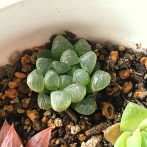 家のハオルチアの家族♪ 祝宴が手前のちび 右がシンビフォルミス 左が花鏡 上が雫石 透けてて癒されます(*´▽`*)