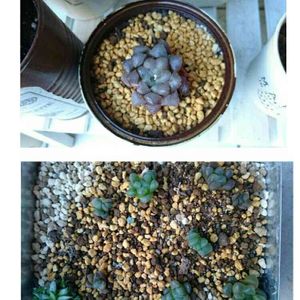 ハオルチア気付けば(*゚ロ゚*)、 缶の中でぎゅうぎゅうで、 リメ缶から出してみると、 太い根っこがぐるぐる巻き(笑)、 子株がポロポロと離れてくれて、 そのまま子株分けしました。 なんて良い子なんでしょう٩(ˊᗜˋ*)و自立派ハオさん! 親株は日差しのせいでちょっと薄紫色に。 ハオさん、正式名忘れてしまいました(•́ε•̀;ก)💦和風だったような💦 早速教えていただきまして、『雫石』✨でした!ありがとうございました😆💠