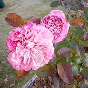 秋薔薇もそろそろ終わりです。 ディスタントドラムスとモナコ王子が咲いています。モナコ王子はほぼ真っ赤に咲いているものもあります。