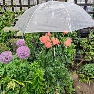 せっかく満開になったオリエンタルポピー あいにくの雨で散りそうになって相棒が傘をさしています