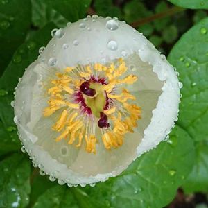 雨滴を帯びたヤマシャクヤクの白いお花🌼🌿 素敵です(*^。^*)🌿 蕊たちも素敵(*^▽^)/★*☆♪