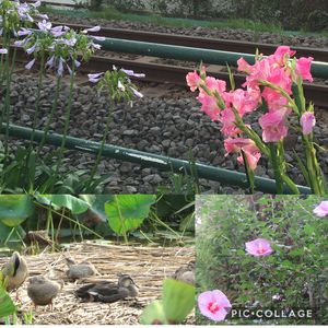 もはや、どれが親だか子だか区別がつかないカルガモ親子。離れた安全地帯でくつろいでました。 5羽いるので、4羽のコガモは無事に育ってたようです。 薄紫のムクゲも、高い場所でこんにちは、してました。 線路沿いの花壇には、手入れされたグラジオラスがちょっと傾きながら、咲いてます。