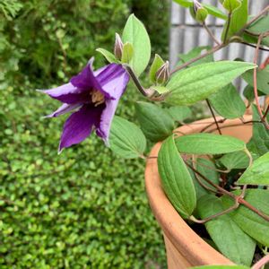 クレマチス サムシングブルー 春先にお花屋さんで小さな苗を買いました。 湘南のクレマチスというブランドで、400円ぐらいでした。 写真ではブルーでしたが、このお色もおしゃれです♪ と、てんとう虫さんも褒めてます👏🏻
