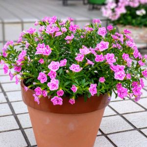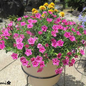 こんにちは♪ スーパーベル ダブルピンクリップル。 8号鉢に1株植えです。 暑さで花持ちが悪いです。 満開は難しいかも。