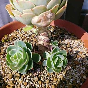 1個は腐った… 1個は茎が怪しくてカット➡︎茎腐れ カットした頭は無事に根っ子が🎵 残った3個の足元には大きめベビー& ミニベビーがたくさん‼️ また親をカットすべきか… 悩むぅ〜っ😭