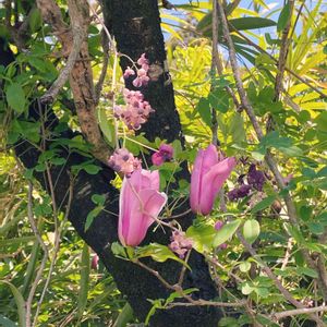 散歩中、木蓮&アケビの花のコラボ発見✨ アケビは、もう実りの秋に向かってるんですね〜(*'▽'*)